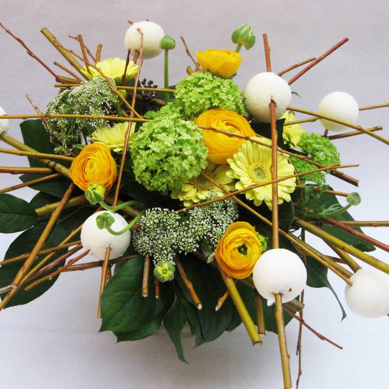 Composition : renoncules, viburnum, germinis, osier jaune, feuillages
