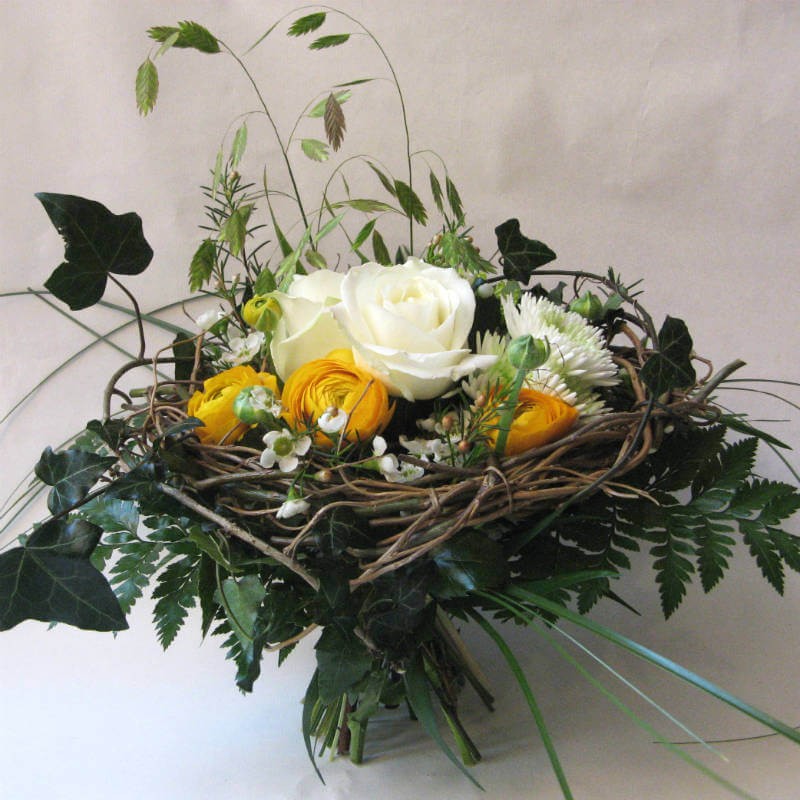 Bouquet naturel de fleurs jaunes et blanches entourées de sa couronne de feuillages.