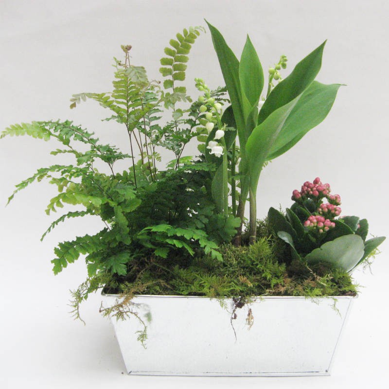 Ce joli jardin de bonheur se compose de muguets en racines, plantes fleuries et vertes.