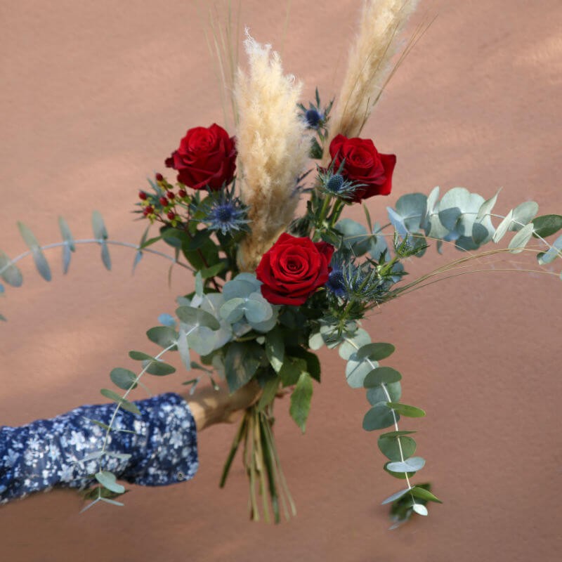 Bouquet festif et joyeux garni de 3 roses rouges gros bouton, 2 herbes de la pampa, eucalyptus et chardons bleus.